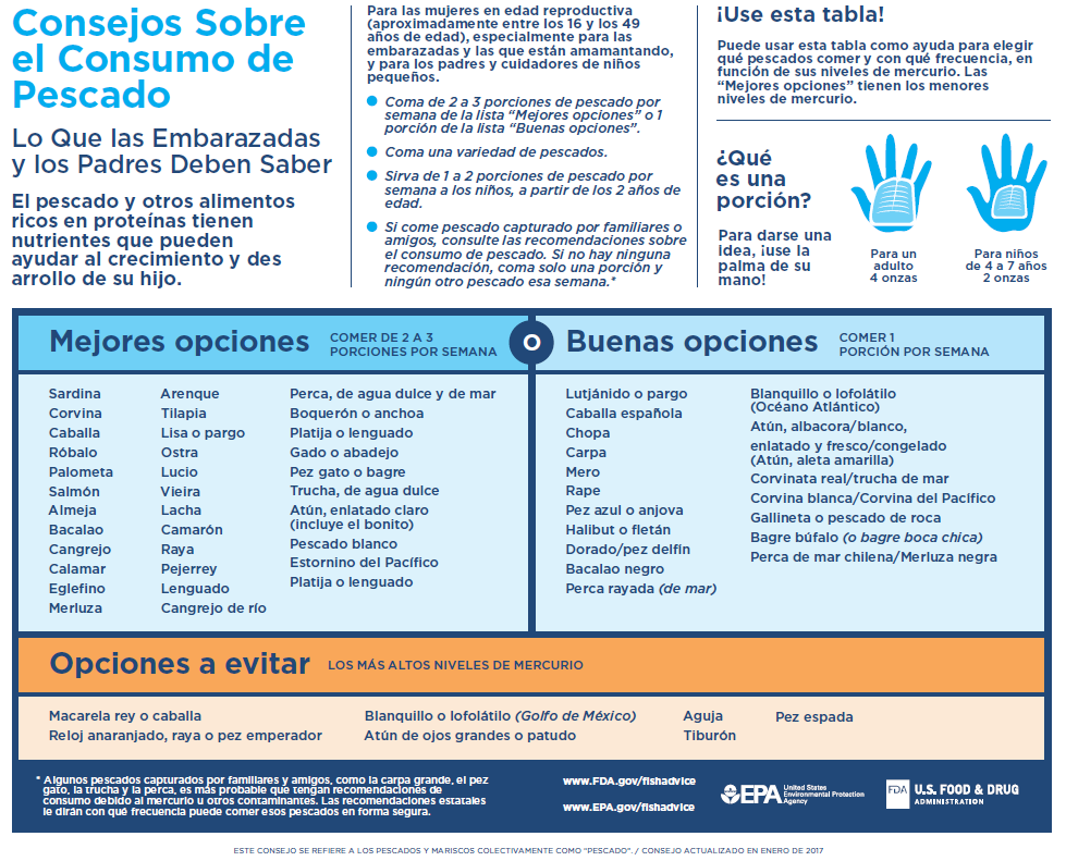 Pescados bajos en mercurio para embarazadas. Por lo tanto la Administración de Alimentos y Drogas FDA por sus siglas en inglés y la Agencia de Protección Ambiental EPA por sus siglas en inglés aconsejan a las mujeres en edad fértil las mujeres embarazadas las madres lactantes y los niños pequeños que eviten comer algunos tipos de pescado y que coman pescado y mariscos bajos en mercurio. Mujeres embarazadas que vayan a estarlo o en período de lactancia. La Administración de Alimentos y Medicamentos FDA por sus siglas en inglés la Agencia de Protección Ambiental EPA por sus siglas en inglés y las Pautas Alimentarias para Estadounidenses de 2015-2020 recomiendan que las mujeres embarazadas coman al menos 8 onzas 225 gramos y hasta 12 onzas 340 gramos a la semana de una variedad de pescado.
